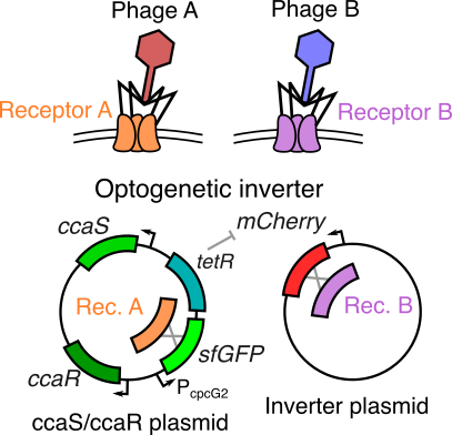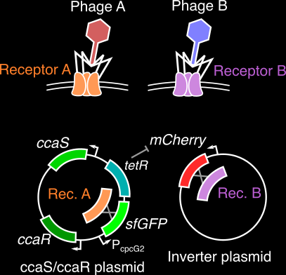Bacteriophage (viruses that infect bacteria) generally require very specific surface proteins (receptors) on a host to infect and propogate. By coupling an two-component optogenetic system with an inverter circuit that can express one of two such phage receptors, we are building a bacterial host that can switch between suscpectibility to different phage when stimulated with red or green light signals. As a graduate mentor, I am training the student, Jenny Sun, on basic molecular biology and cloning protocols, along with methods to characterize the performance of this optogenetic system.